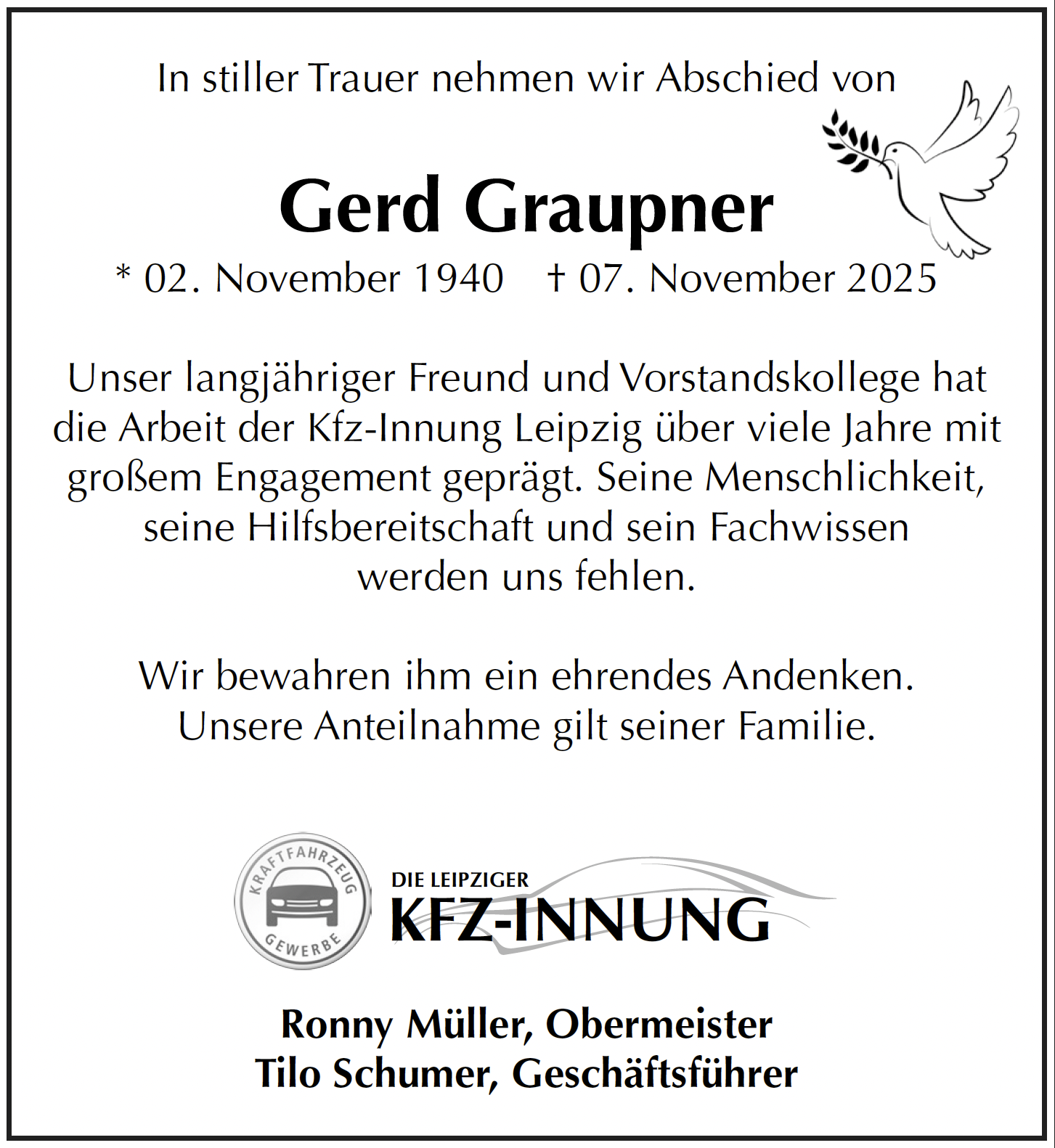 Gerd Graupner war sehr lange im Vorstand der Leipziger Kfz-Innung aktiv. Durch seine sympathische, ruhige Art und seine fundierten Kenntnisse, war Gerd Vorbild, Ratgeber und guter Freund für uns.