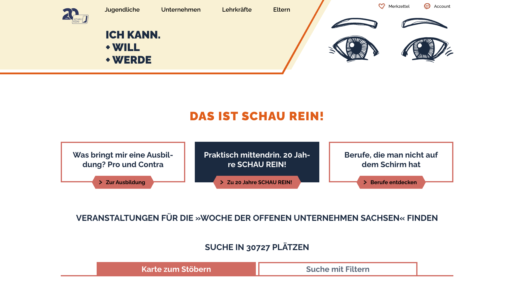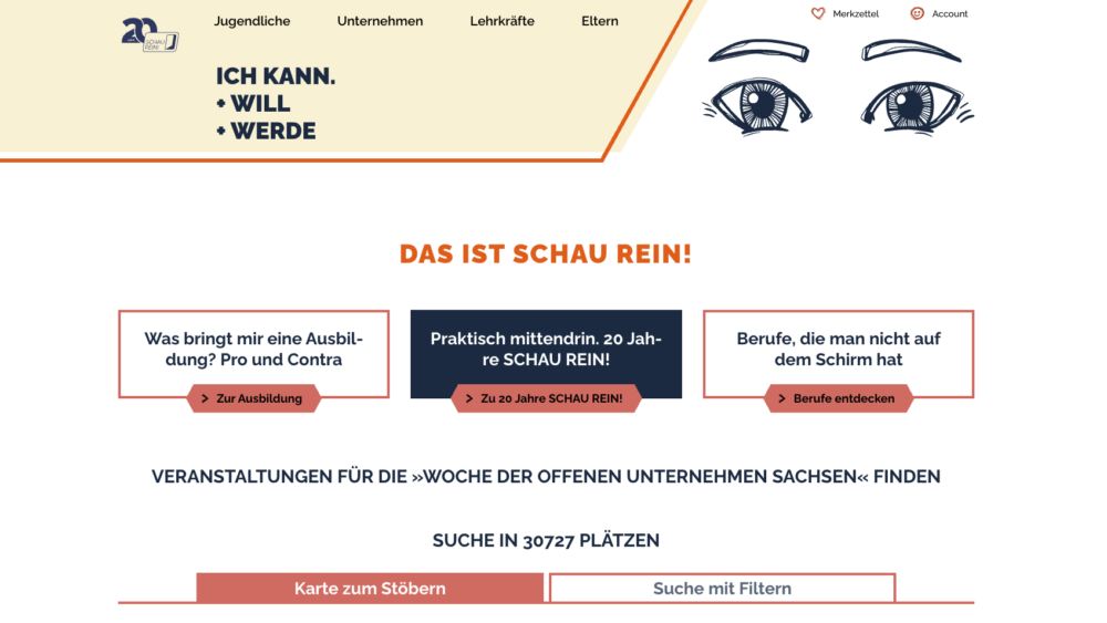 Sie haben noch bis einschließlich 24. November 2025 die Möglichkeit, auf www.schau-rein-sachsen.de Ihre Angebote zu veröffentlichen, damit sie kostenfrei im Angebots-PDF des SCHAU-REIN!-Magazins erscheinen. Nutzen Sie diese Gelegenheit, um Ihren Betrieb und Ihre Teilnahme an der „Woche der offenen Unternehmen“ für Schüler/-innen sichtbarer zu machen. Und damit die Chance, gut gebucht zu werden!