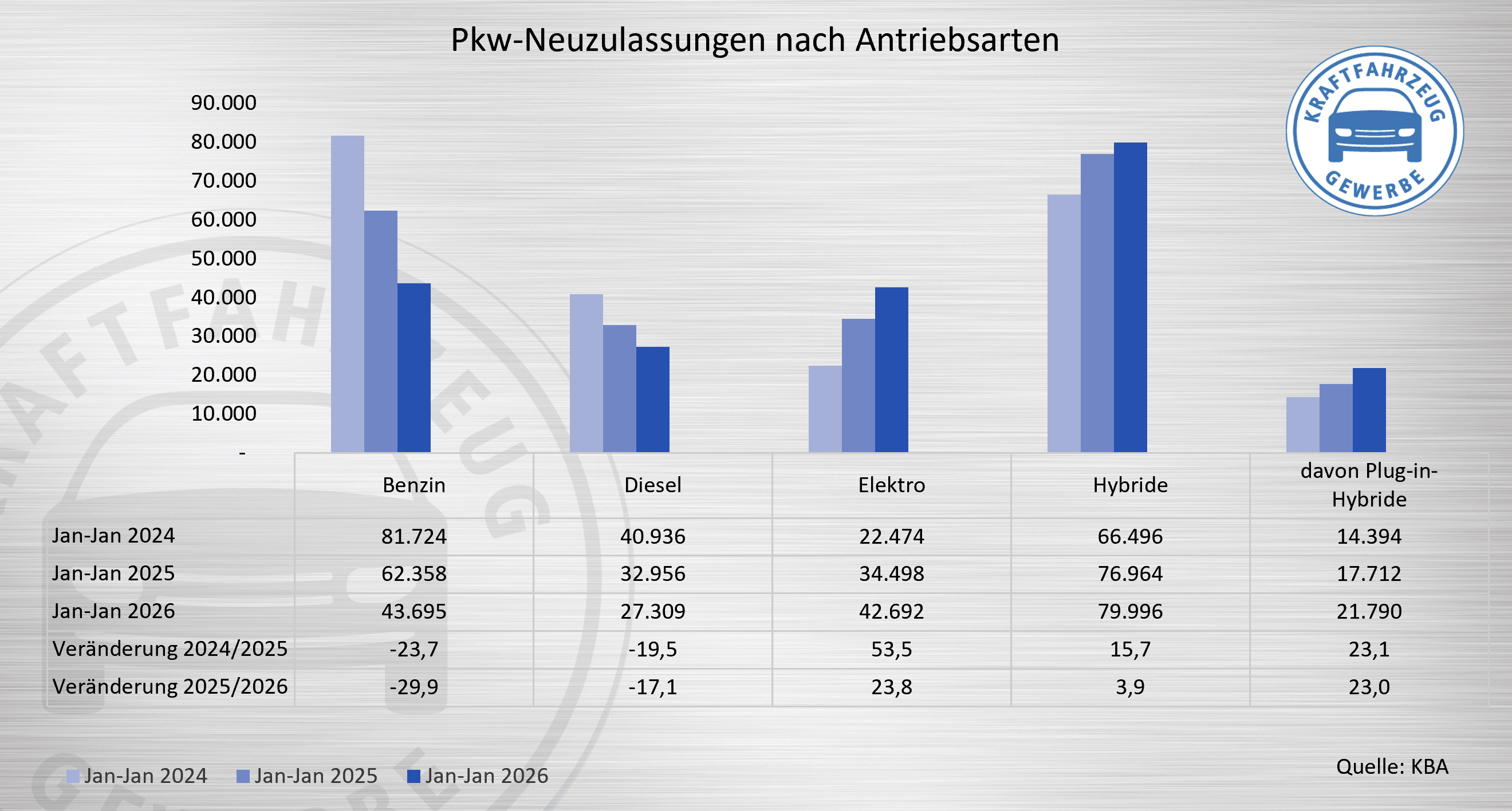 So gingen die Neuzulassungen von Benzin-Pkw um 29,9 Prozent, die von Diesel-Pkw um 17,1 Prozent gegenüber Januar 2025 zurück. Demgegenüber verzeichneten Elektrofahrzeuge (BEV) und Hybridmodelle im Vorjahresvergleich Zuwächse.